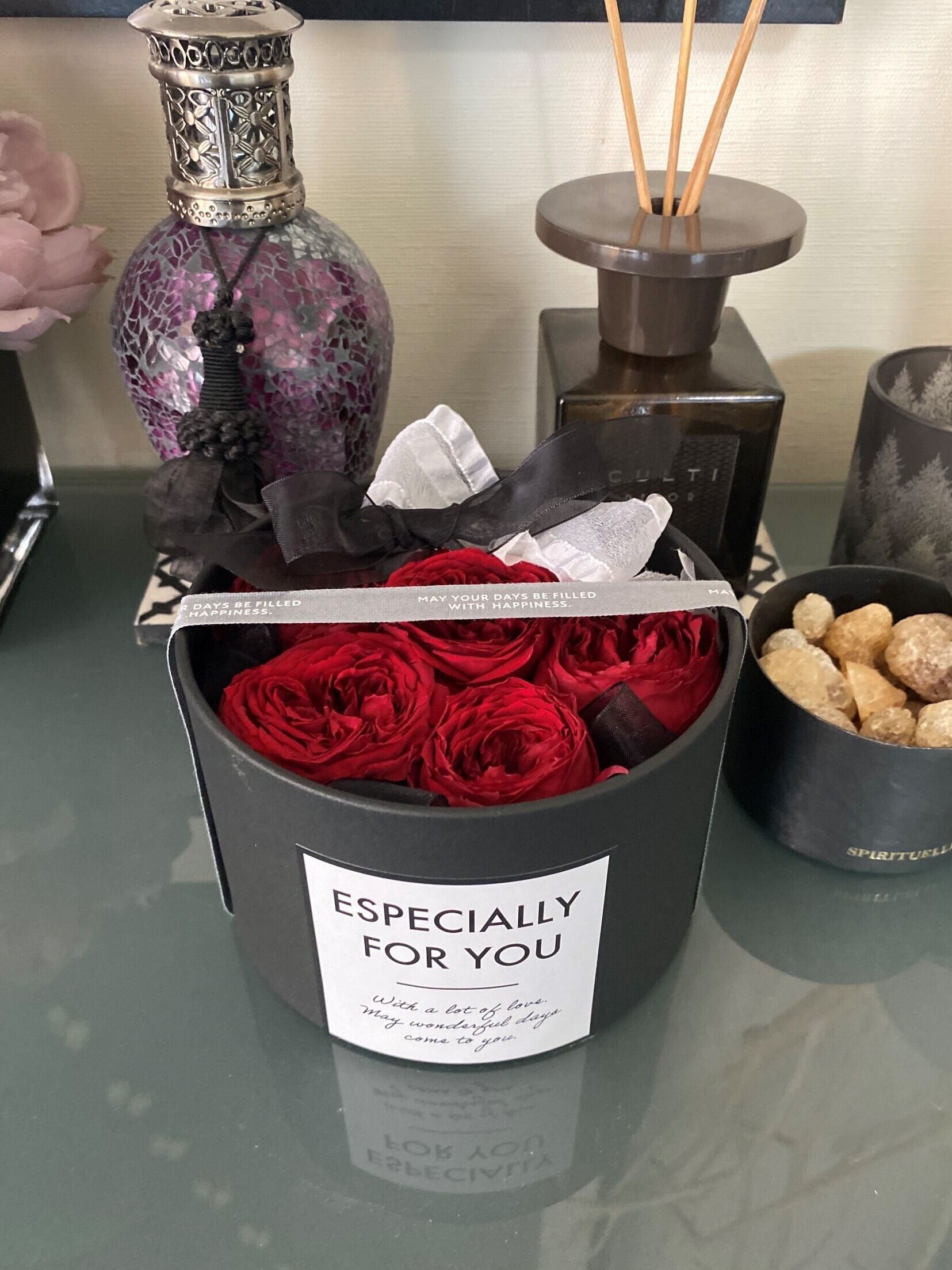 une rose rouge vif 真紅のオールドローズアレンジメントBOX〔プリザーブドフラワー/結婚祝い/記念日の花/開店祝い/開業祝い/還暦祝い/退職祝い/誕生日プレゼント/引っ越し祝い/新築祝い/イエロー/オレンジ/花ギフト/花アレンジ〕 | プリザーブドフラワー Le Chainon