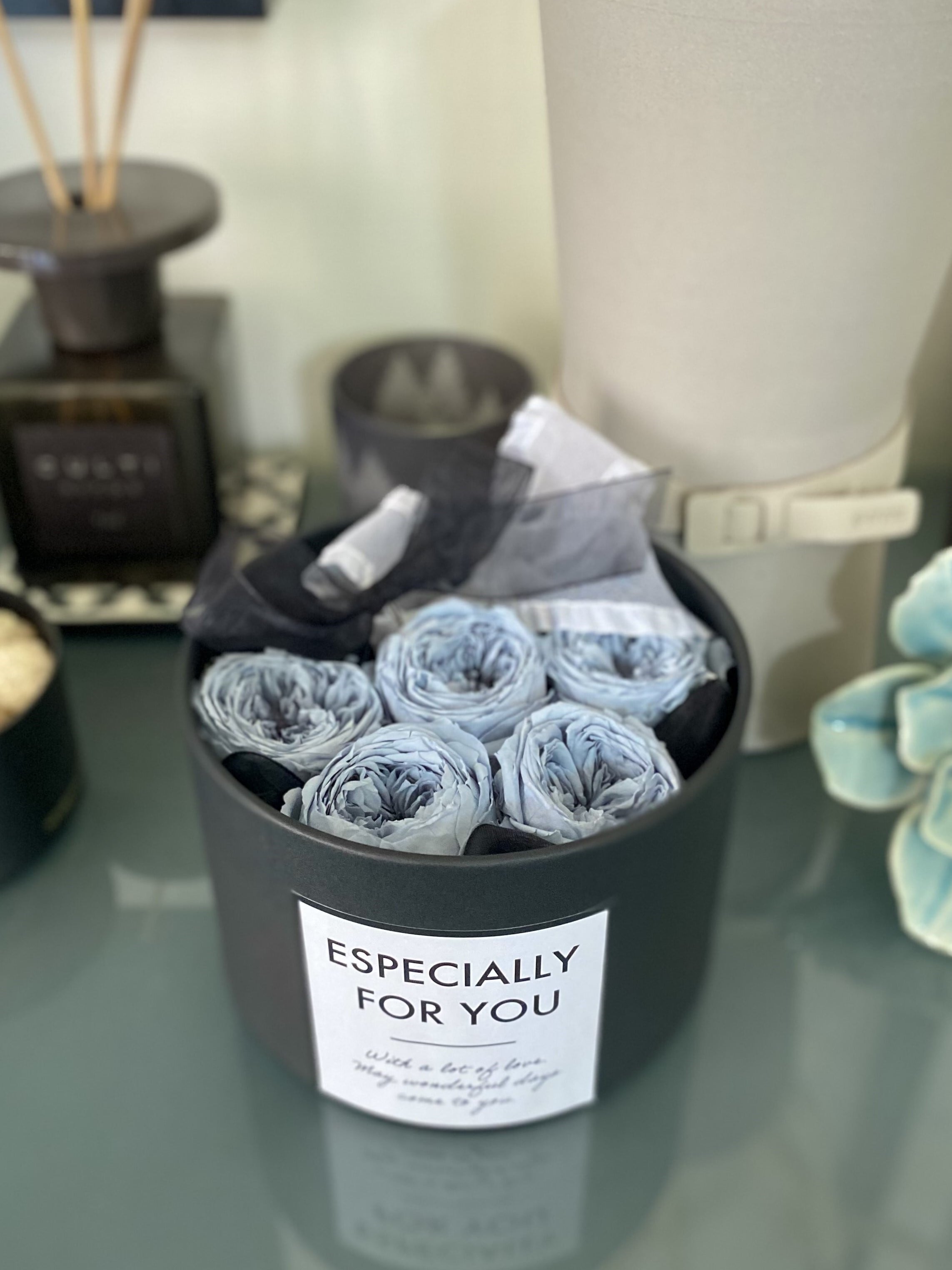 bleu brumeux ミストブルーのオールドローズアレンジメントBOX〔プリザーブドフラワー/結婚祝い/記念日の花/開店祝い/開業祝い/還暦祝い/退職祝い/誕生日プレゼント/引っ越し祝い/新築祝い/イエロー/オレンジ/花ギフト/花アレンジ〕 | プリザーブドフラワー Le Chainon
