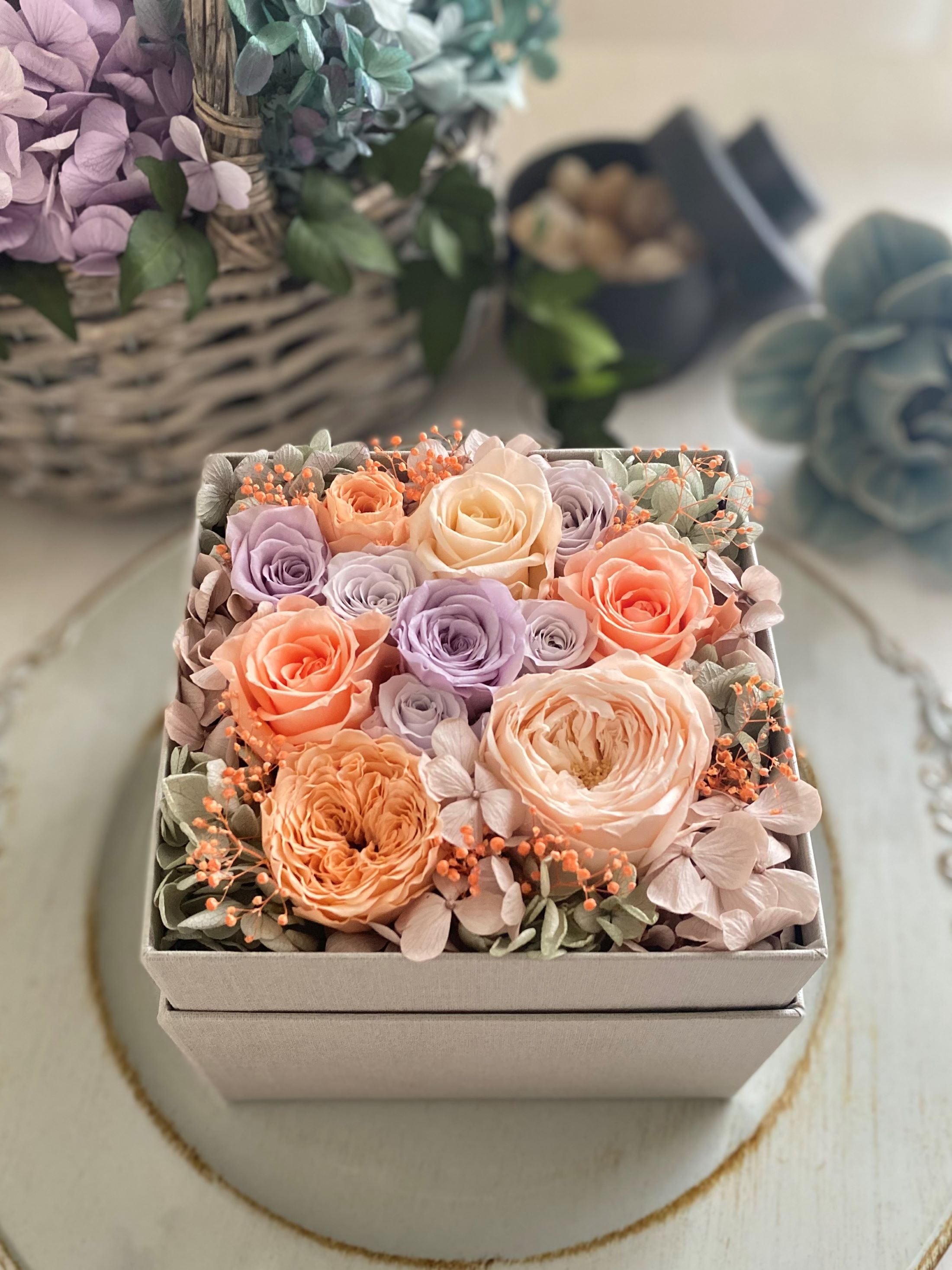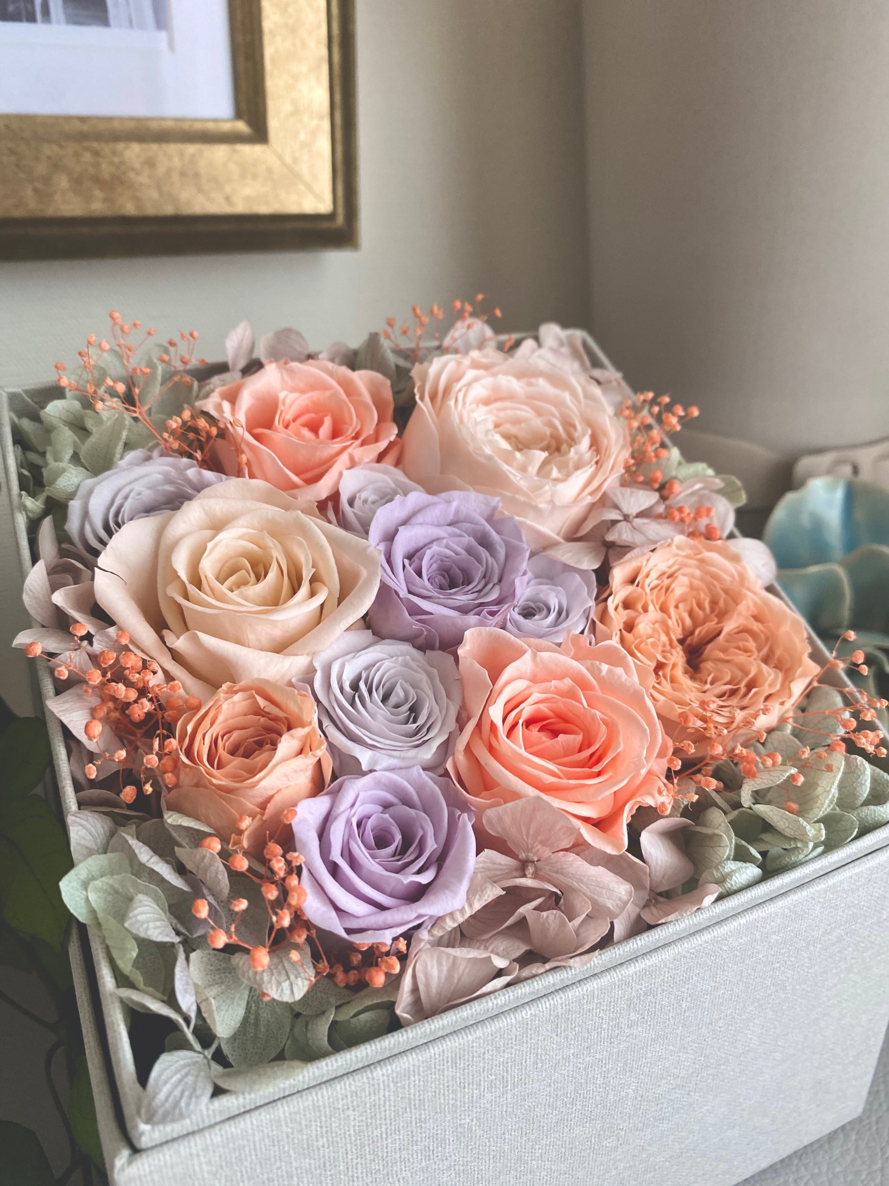 Pierre de Lune Peche 優しいオレンジがあたたかい癒しカラーのアレンジメントBOX〔プリザーブドフラワー/結婚祝い/記念日の花/開店祝い/開業祝い/還暦祝い/退職祝い/誕生日プレゼント/引っ越し祝い/新築祝い/イエロー/オレンジ/花ギフト/花アレンジ〕 | プリザーブドフラワー Le Chainon