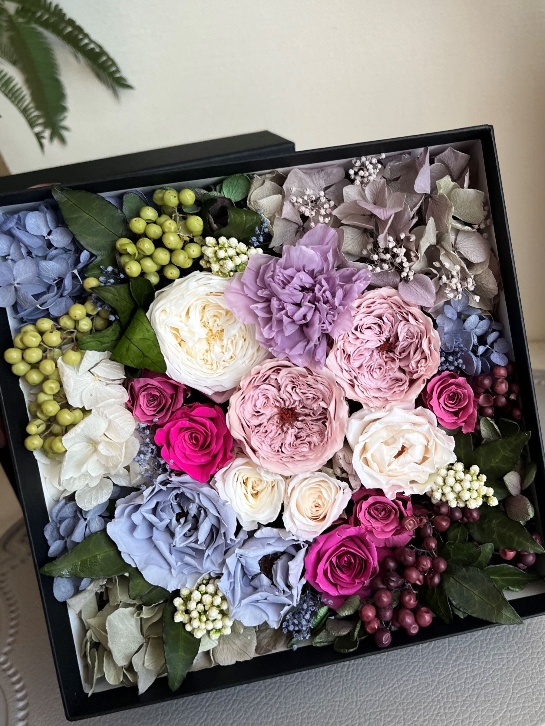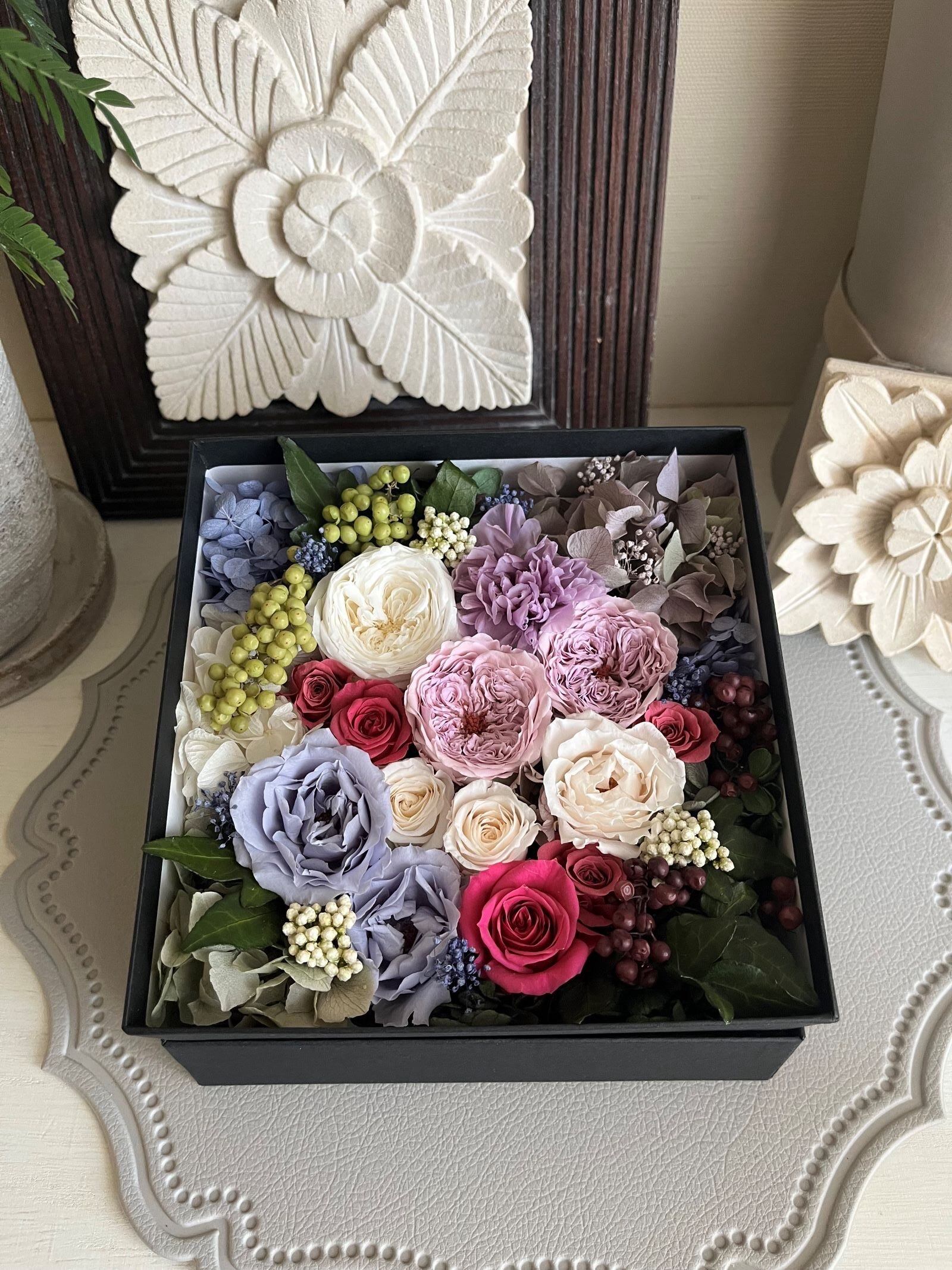 MARIE 艶やかでミステリアスなアレンジ スクエアBOX〔プリザーブドフラワー/結婚祝い/記念日の花/開店祝い/開業祝い/還暦祝い/退職祝い/誕生日プレゼント/引っ越し祝い/新築祝い/パープル/花ギフト/花アレンジ〕 | プリザーブドフラワー Le Chainon