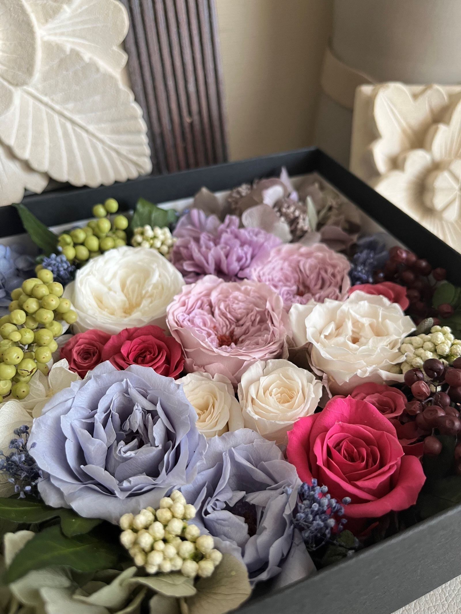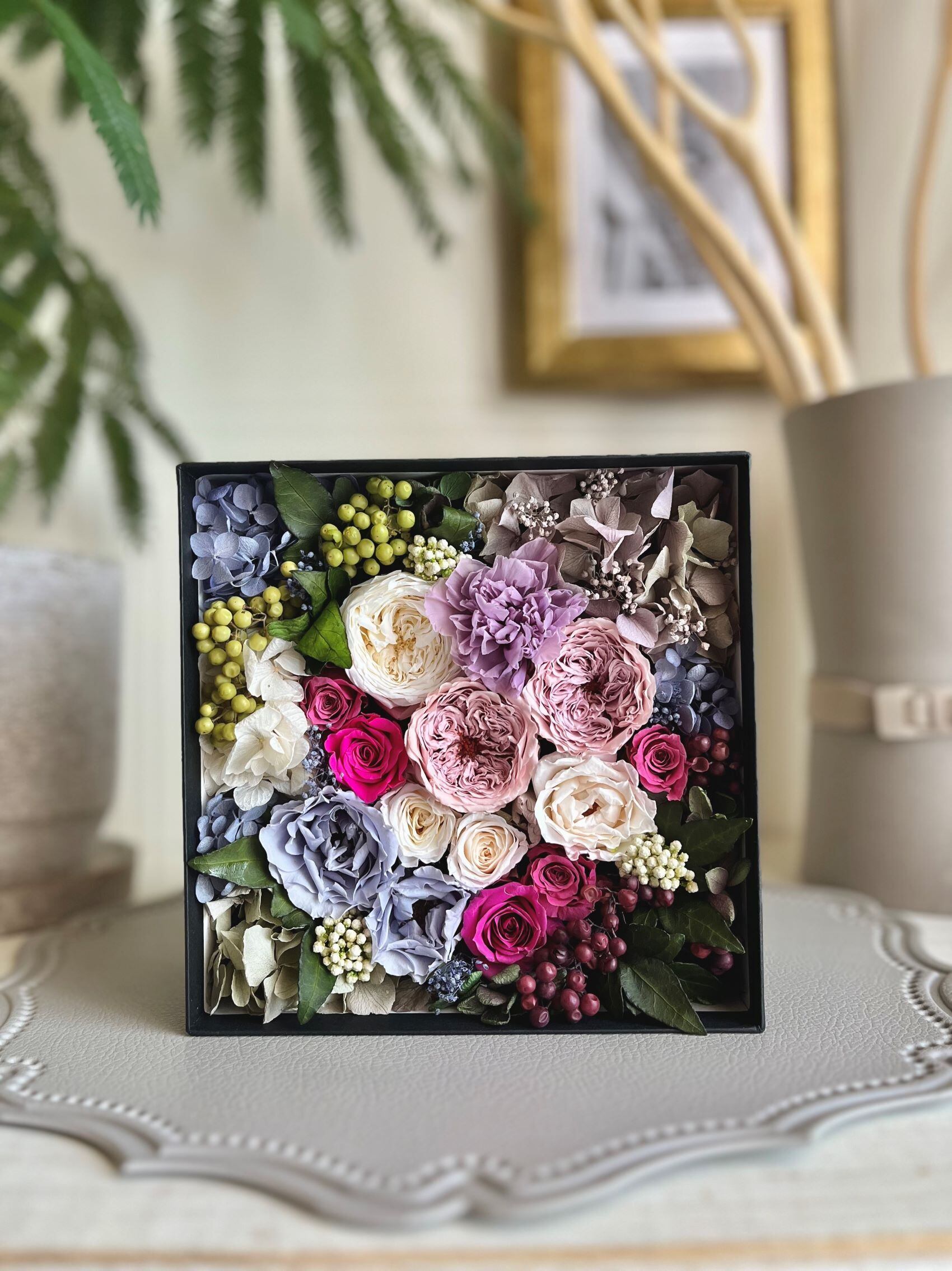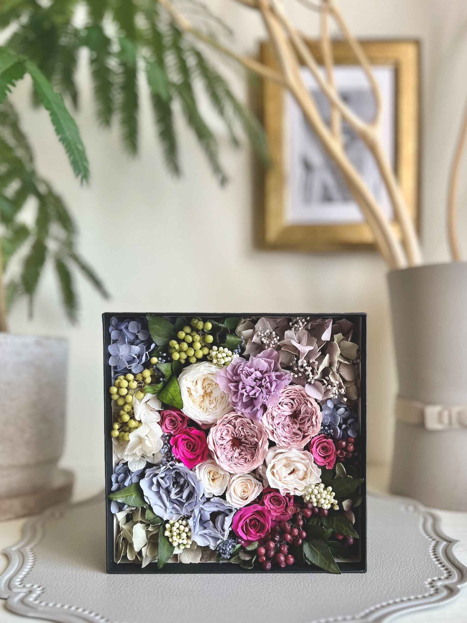 スクエア型の黒いBOXに沢山のお花を敷き詰めて華やかで存在感のある雰囲気にに仕上がっているので、飾った場所を艶やかで大人のシックなイメージにしてくれます